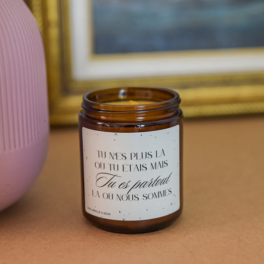 Toutes nos bougies sont 100% naturelles et françaises. Nous avons fait le choix d'une cire saine et qui brûle longtemps afin de vous proposer des bougies d'excellentes qualité. Il s'agit de bougies en cire d'abeille de La Fabrique de l'Abeille, spécialement adaptées avec des étiquettes uniques conçues pour honorer la mémoire de vos proches.