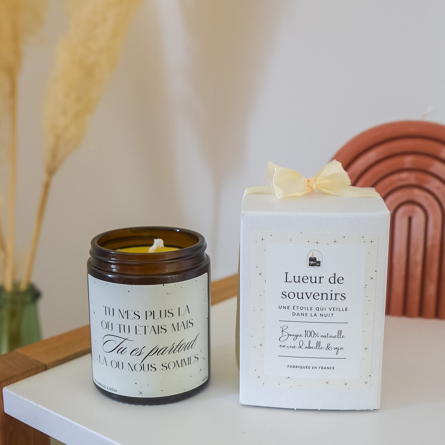 Toutes nos bougies sont 100% naturelles et françaises. Nous avons fait le choix d'une cire saine et qui brûle longtemps afin de vous proposer des bougies d'excellentes qualité. Il s'agit de bougies en cire d'abeille de La Fabrique de l'Abeille, spécialement adaptées avec des étiquettes uniques conçues pour honorer la mémoire de vos proches.